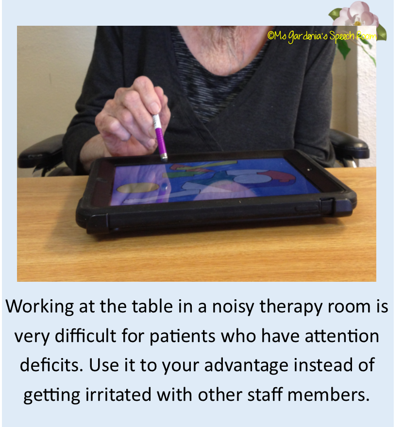 We had already worked on attention sitting at the table in a crowded and noisy therapy room by completing peg patterns of increasing complexity, working on large print word find puzzles, simple jigsaw puzzles, etc. This patient really enjoyed using the iPad so apps were introduced early on for problem solving and attention skills.